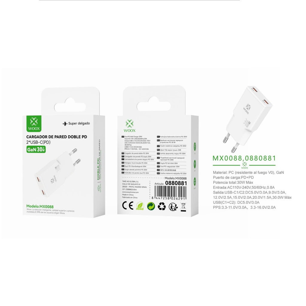 Cargador de pared EU PD+PD GaN 30 W sin cable blanco - MX0088 BL