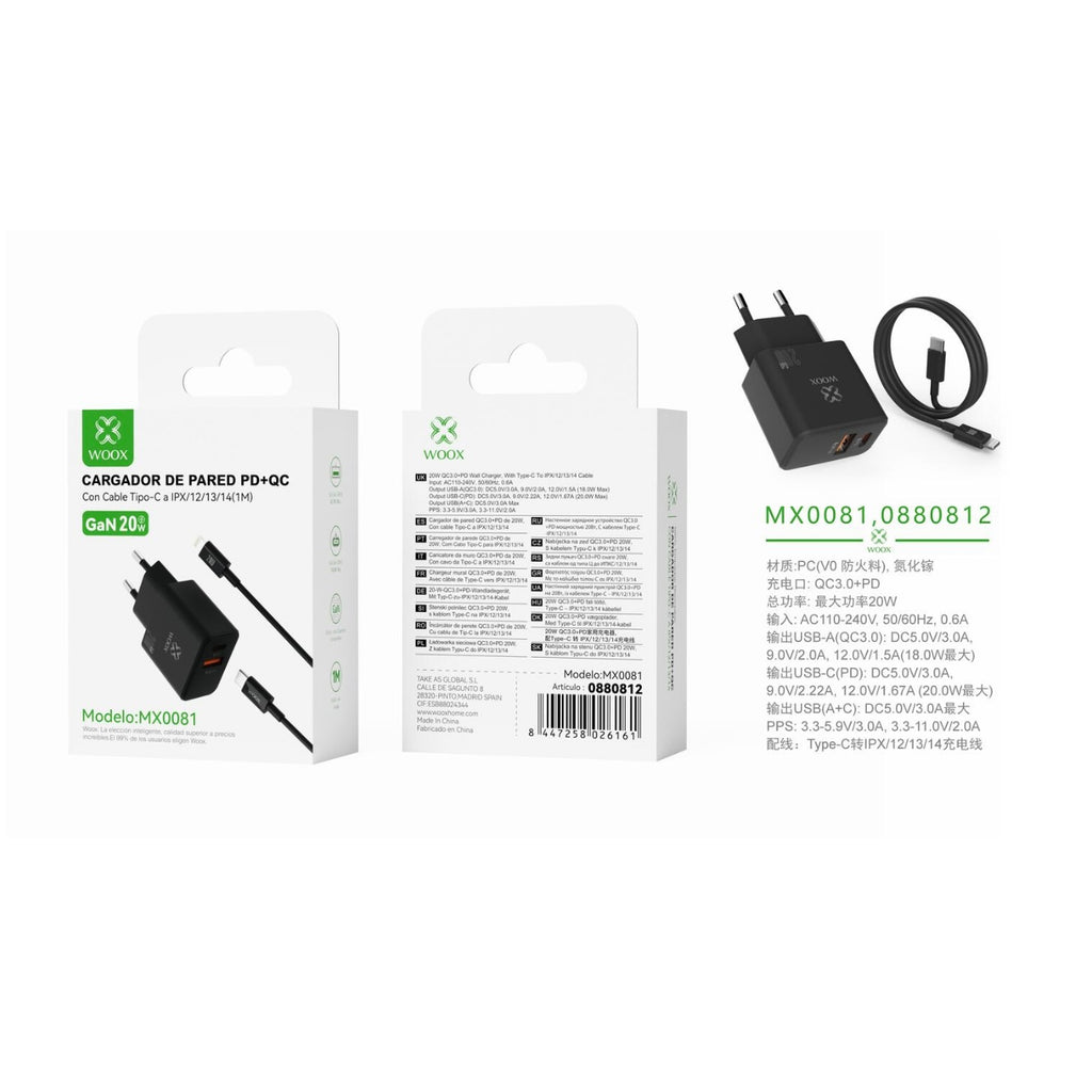 Cargador de pared UE QC+PD GaN de 20 W con cable C-Lightning (negro) - MX0081 NE