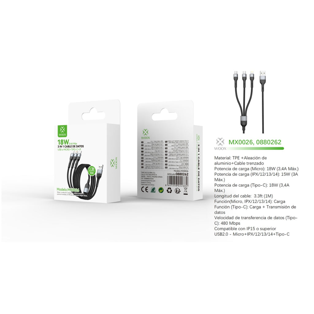 Cable de datos 3 en 1 USB a Micro+Tipo C+Lightning 18 W 1 m - Negro - MX0026